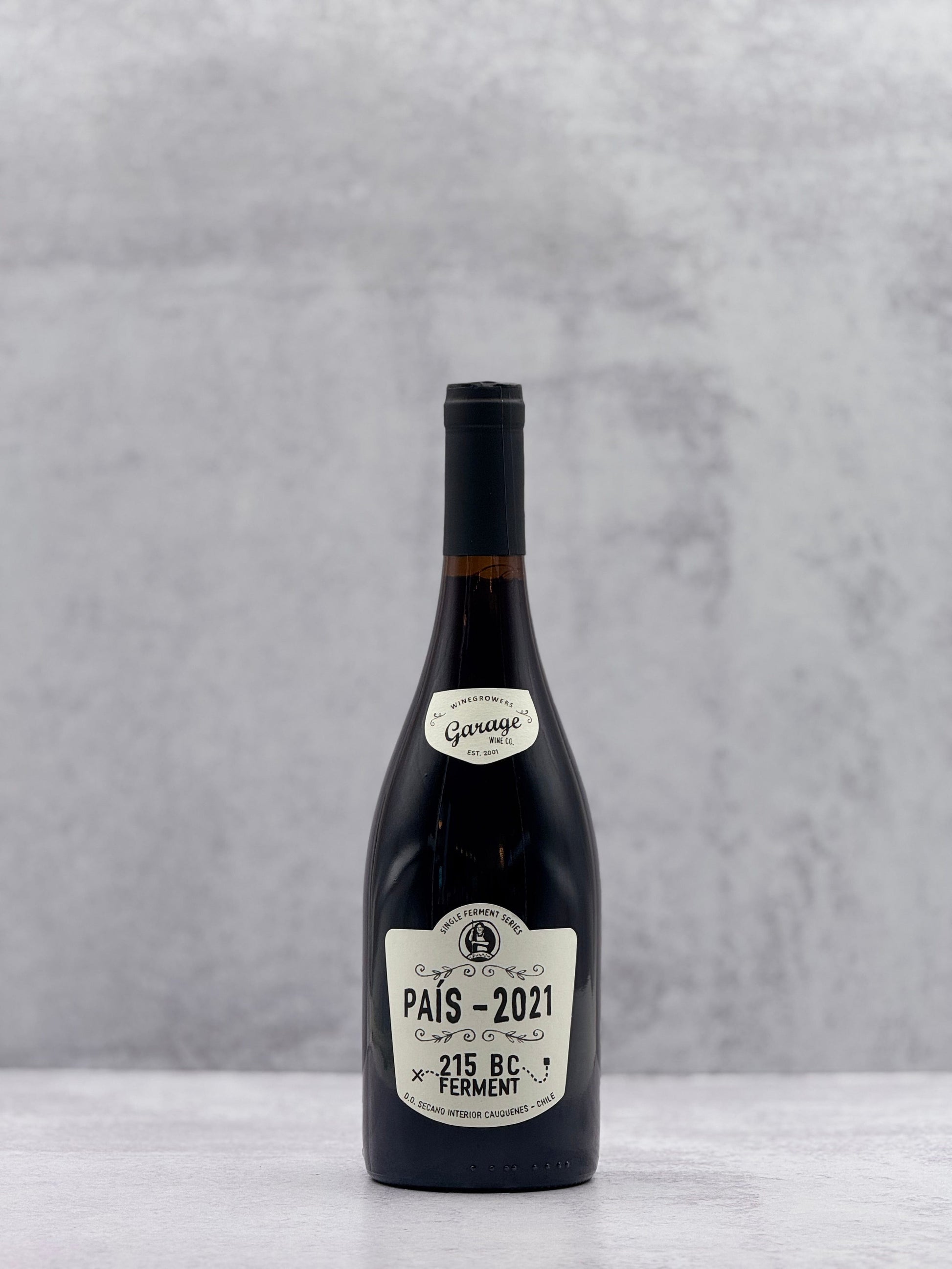 Garage Wine Co.'s 2021 “215 BC Ferment” País is a vibrant red from Chile’s Maule Valley, showcasing the character of old-vine País grapes. Fermented with native yeasts in open-top vats and aged in neutral barrels, it offers notes of maraschino cherry, plum marmalade, and herbal nuances, with fine-grained tannins and a juicy, compact mouthfeel. The name "215 BC" references the historical cultivation of País in Chile, predating Cabernet Sauvignon by 215 years, highlighting the winery's dedication to reviving ancient winemaking traditions.